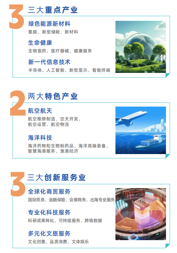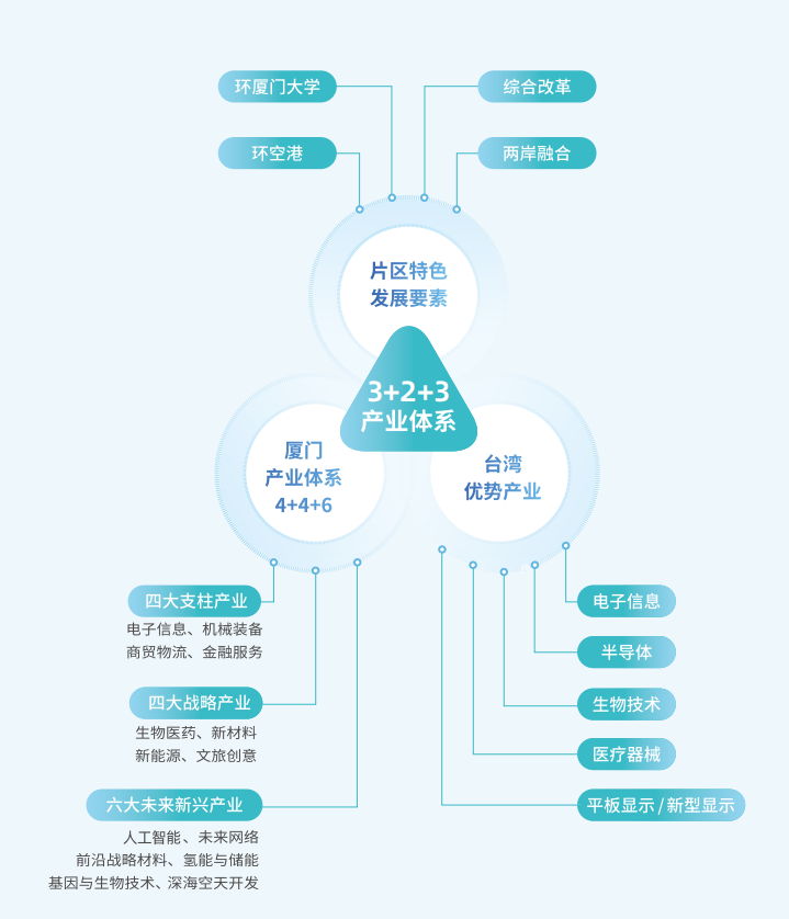 片区基于厦门市“4+4+6”现代化产业体系,以“重点产业强基、特色产业铸牌、创新服务增效”为发展逻辑,构建“3+2+3”产业体系,即“绿色能源新材料、生命健康、新一代信息技术”三大重点产业,瞄准前沿技术打造全链竞争力;“航空航天、海洋科技”两大特色产业,空海联动塑造特色发展标杆;“全球化商贸服务、专业化科技服务、多元化文旅服务”三大创新服务业,赋能产业,提升区域价值。